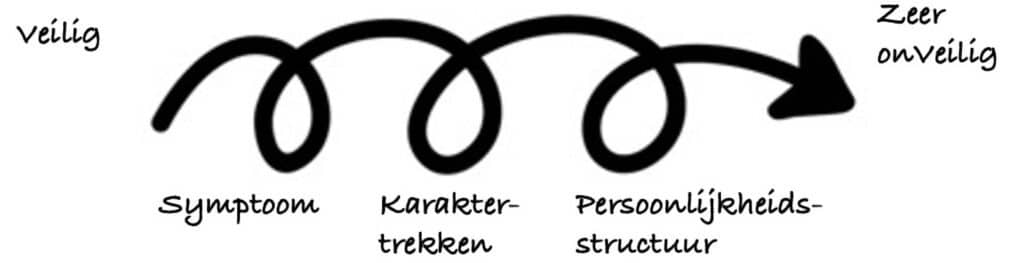 Op het continuüm van veilig naar onveilig gehecht is in steeds grotere mate sprake van verankering van onveiligheid en de onveilige hechtingsstijl in de persoonlijkheidsstructuur. Hieronder geef ik, op basis van de ervaringen in mijn praktijk, mijn visie op dit continuüm.